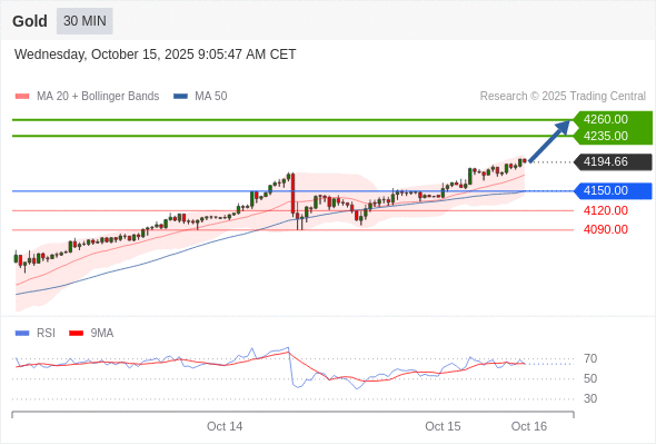在 4150.00 之上,看涨,目标价位为 4235.00 ,然后为 4260.00 。