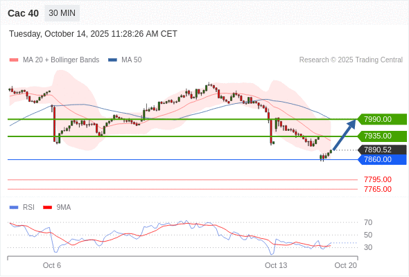 Cac 40 当日内: 超短线(当日内)支撑位在7860.00附近。
